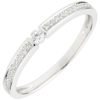 Un diamant solitaire éclatant se fait le centre d'une couronne de diamants pavés. Une bague raffinée et précieuse qui se porte avec une grande aisance au quotidien du fait de l'absence de griffes autour du solitaire. Diamant de centre: 0.052 carats - 22 diamants de côtés: 0.004 carats chacun 23 diamants : 0.14 carat - Or blanc (18 carats = 750/-): 2 g. Plus dimensions