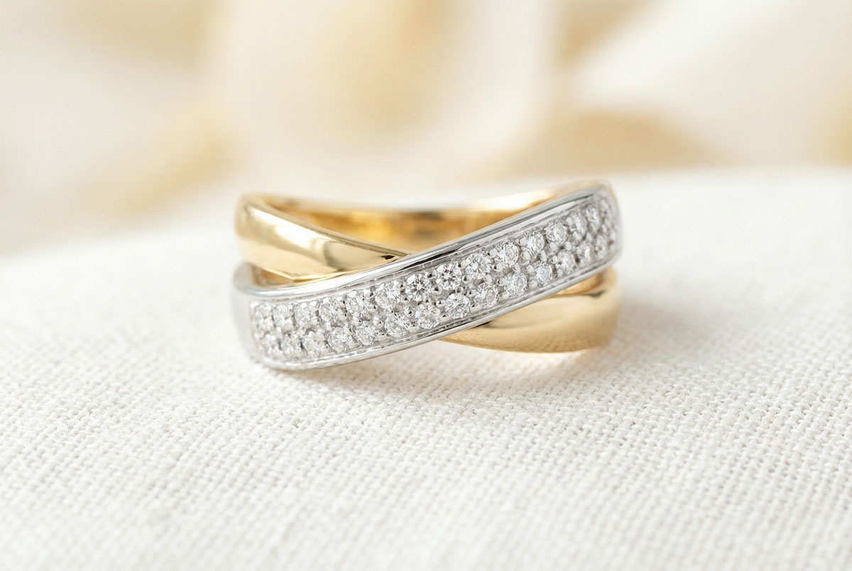 Un tandem d'ellipses or jaune et or blanc pavé, pour une alliance et une harmonie parfaite.