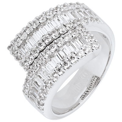 Trois rangs de diamants, brillants et baguettes en écharpe pour un effet riche et luxueux sur or blanc.