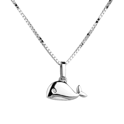 Un bébé baleine jovial et rond pour accompagner toutes les aventures. Or blanc et oeil en diamant. Grand modèle. Livré sans chaîne. 1 diamant : 0.05 carat - Or blanc (18 carats = 750/-): 0.6 g. Plus dimensions