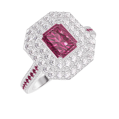 « L'ATELIER » Nº1063244Bague Or blanc 9 carats - Rubis synthétique Rectangle 0.5 carat - Halo Diamant synthétique - Sertissage Rubis