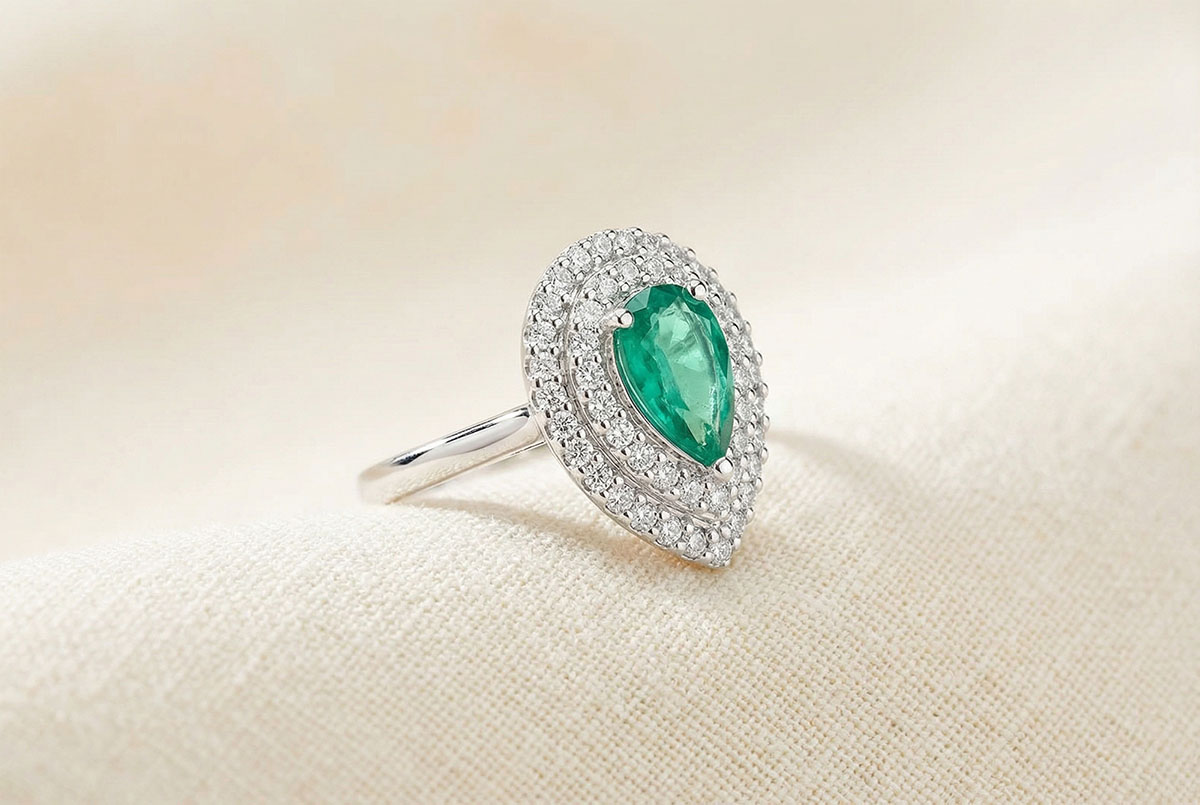 « L'ATELIER » Nº 1064520Bague Or blanc 9 carats - Émeraude synthétique Poire 0.5 carat - Halo Diamant synthétique