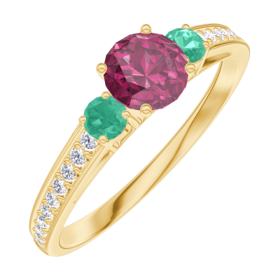 « L'ATELIER » Nº 160686Bague Or jaune 9 carats - Rubis Rond 0.3 carat - Pierres de côté Émeraude - Sertissage Diamant 4.5