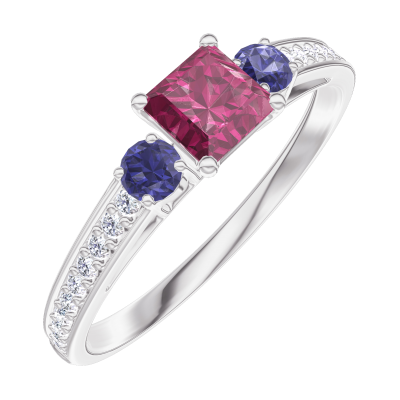 « L'ATELIER » Nº 160768Bague Or blanc 9 carats - Rubis Princesse 0.3 carat - Pierres de côté Saphir bleu - Sertissage Diamant