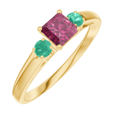 « L'ATELIER » Nº 160782Bague Or jaune 9 carats - Rubis Princesse 0.3 carat - Pierres de côté Émeraude