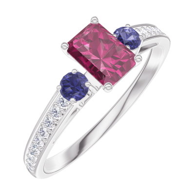 « L'ATELIER » Nº 160868Bague Or blanc 9 carats - Rubis Rectangle 0.3 carat - Pierres de côté Saphir bleu - Sertissage Diamant