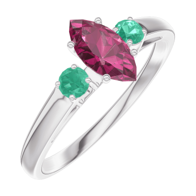 « L'ATELIER » Nº161184Bague Or blanc 9 carats - Rubis Marquise 0.3 carat - Pierres de côté Émeraude