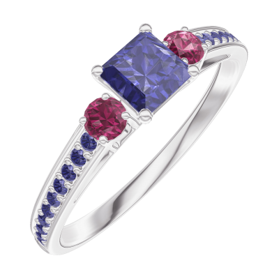 « L'ATELIER » Nº 161356Bague Or blanc 9 carats - Saphir bleu Princesse 0.3 carat - Pierres de côté Rubis - Sertissage Saphir bleu