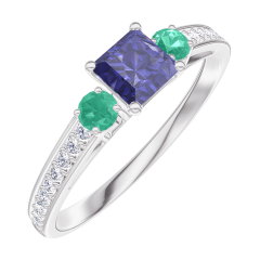 Bague Or blanc 9 carats - Saphir bleu Princesse 0.3 carat - Pierres de côté Émeraude - Sertissage Diamant
