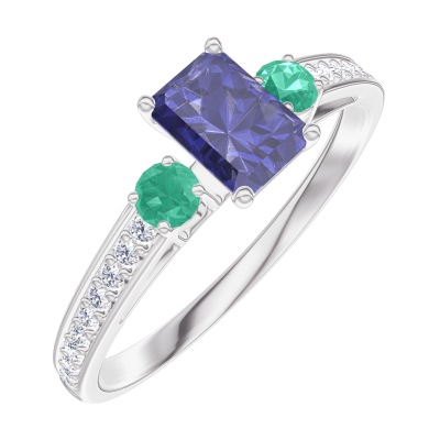 « L'ATELIER » Nº161488Bague Or blanc 9 carats - Saphir bleu Rectangle 0.3 carat - Pierres de côté Émeraude - Sertissage Diamant