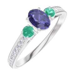 Pourquoi nous faire confiance ? « L'ATELIER » Nº 161588 Bague Or blanc 9 carats - Saphir bleu Ovale 0.3 carat - Pierres de côté Émeraude - Sertissage Diamant