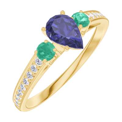 « L'ATELIER » Nº 161685Bague Or jaune 18 carats - Saphir bleu Poire 0.3 carat - Pierres de côté Émeraude - Sertissage Diamant
