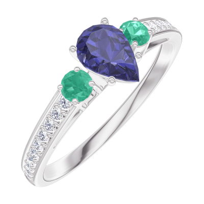 « L'ATELIER » Nº 161687Bague Or blanc 18 carats - Saphir bleu Poire 0.3 carat - Pierres de côté Émeraude - Sertissage Diamant