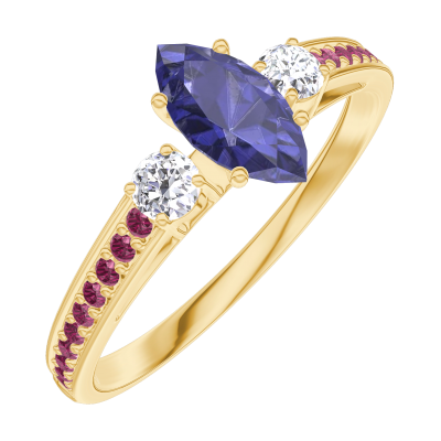 « L'ATELIER » Nº161730Bague Or jaune 9 carats - Saphir bleu Marquise 0.3 carat - Pierres de côté Diamant - Sertissage Rubis