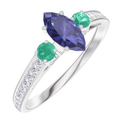 Pourquoi nous faire confiance ? « L'ATELIER » Nº 161788 Bague Or blanc 9 carats - Saphir bleu Marquise 0.3 carat - Pierres de côté Émeraude - Sertissage Diamant