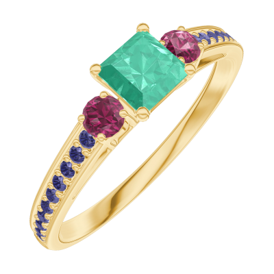 « L'ATELIER » Nº 161953Bague Or jaune 18 carats - Émeraude Princesse 0.3 carat - Pierres de côté Rubis - Sertissage Saphir bleu
