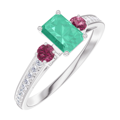 « L'ATELIER » Nº162047Bague Or blanc 18 carats - Émeraude Rectangle 0.3 carat - Pierres de côté Rubis - Sertissage Diamant