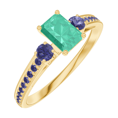 « L'ATELIER » Nº162074Bague Or jaune 9 carats - Émeraude Rectangle 0.3 carat - Pierres de côté Saphir bleu - Sertissage Saphir bleu