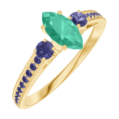 « L'ATELIER » Nº162374Bague Or jaune 9 carats - Émeraude Marquise 0.3 carat - Pierres de côté Saphir bleu - Sertissage Saphir bleu