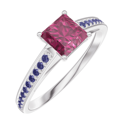 « L'ATELIER » Nº163116Bague Or blanc 9 carats - Rubis Princesse 0.5 carat - Sertissage Saphir bleu
