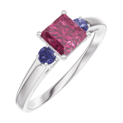 « L'ATELIER » Nº163164Bague Or blanc 9 carats - Rubis Princesse 0.5 carat - Pierres de côté Saphir bleu