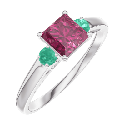 « L'ATELIER » Nº163184Bague Or blanc 9 carats - Rubis Princesse 0.5 carat - Pierres de côté Émeraude