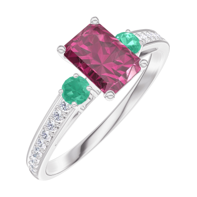 « L'ATELIER » Nº163288Bague Or blanc 9 carats - Rubis Rectangle 0.5 carat - Pierres de côté Émeraude - Sertissage Diamant