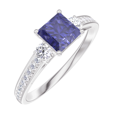 « L'ATELIER » Nº 163728Bague Or blanc 9 carats - Saphir bleu Princesse 0.5 carat - Pierres de côté Diamant - Sertissage Diamant