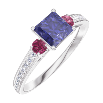 « L'ATELIER » Nº163748Bague Or blanc 9 carats - Saphir bleu Princesse 0.5 carat - Pierres de côté Rubis - Sertissage Diamant