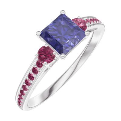 « L'ATELIER » Nº163751Bague Or blanc 18 carats - Saphir bleu Princesse 0.5 carat - Pierres de côté Rubis - Sertissage Rubis