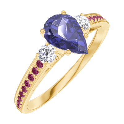 « L'ATELIER » Nº164030Bague Or jaune 9 carats - Saphir bleu Poire 0.5 carat - Pierres de côté Diamant - Sertissage Rubis