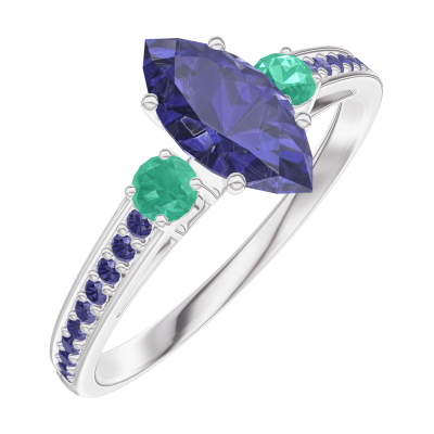 « L'ATELIER » Nº164196Bague Or blanc 9 carats - Saphir bleu Marquise 0.5 carat - Pierres de côté Émeraude - Sertissage Saphir bleu