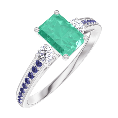 « L'ATELIER » Nº 164436Bague Or blanc 9 carats - Émeraude Rectangle 0.5 carat - Pierres de côté Diamant - Sertissage Saphir bleu