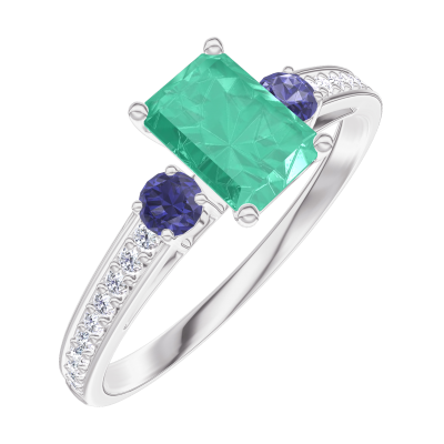 « L'ATELIER » Nº164467Bague Or blanc 18 carats - Émeraude Rectangle 0.5 carat - Pierres de côté Saphir bleu - Sertissage Diamant