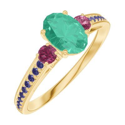 « L'ATELIER » Nº164554Bague Or jaune 9 carats - Émeraude Ovale 0.5 carat - Pierres de côté Rubis - Sertissage Saphir bleu