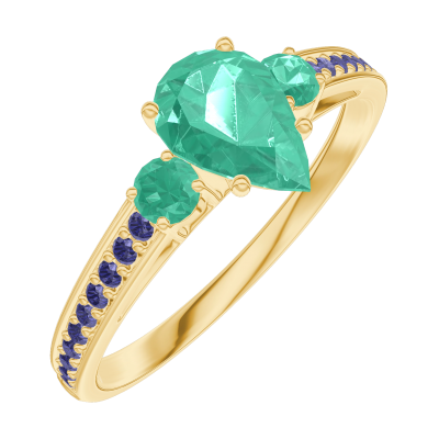 « L'ATELIER » Nº164694Bague Or jaune 9 carats - Émeraude Poire 0.5 carat - Pierres de côté Émeraude - Sertissage Saphir bleu