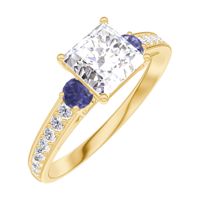 « L'ATELIER » Nº 164966Bague Or jaune 9 carats - Diamant Princesse 0.7 carat - Pierres de côté Saphir bleu - Sertissage Diamant