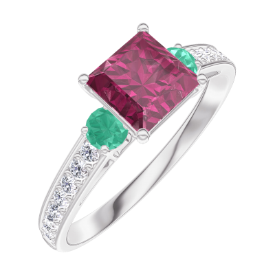 « L'ATELIER » Nº 165588Bague Or blanc 9 carats - Rubis Princesse 0.7 carat - Pierres de côté Émeraude - Sertissage Diamant