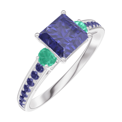 « L'ATELIER » Nº 166196Bague Or blanc 9 carats - Saphir bleu Princesse 0.7 carat - Pierres de côté Émeraude - Sertissage Saphir bleu
