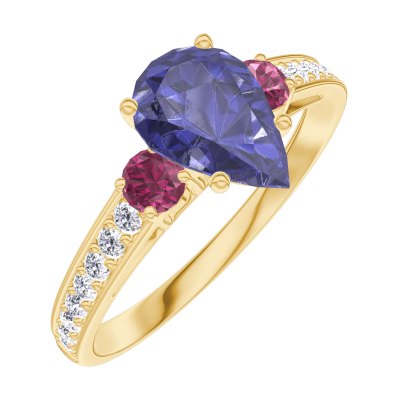 « L'ATELIER » Nº166445Bague Or jaune 18 carats - Saphir bleu Poire 0.7 carat - Pierres de côté Rubis - Sertissage Diamant