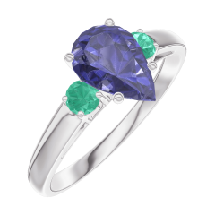 Pourquoi nous faire confiance ? « L'ATELIER » Nº 166484 Bague Or blanc 9 carats - Saphir bleu Poire 0.7 carat - Pierres de côté Émeraude