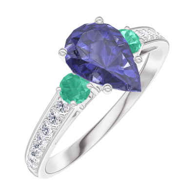 « L'ATELIER » Nº166488Bague Or blanc 9 carats - Saphir bleu Poire 0.7 carat - Pierres de côté Émeraude - Sertissage Diamant