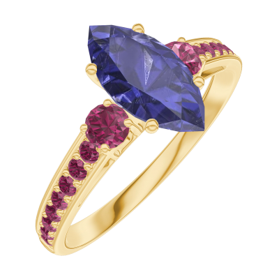 « L'ATELIER » Nº 166549Bague Or jaune 18 carats - Saphir bleu Marquise 0.7 carat - Pierres de côté Rubis - Sertissage Rubis