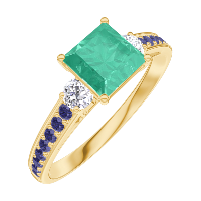 « L'ATELIER » Nº166734Bague Or jaune 9 carats - Émeraude Princesse 0.7 carat - Pierres de côté Diamant - Sertissage Saphir bleu