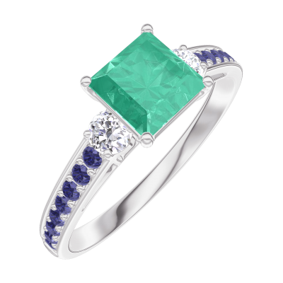 « L'ATELIER » Nº 166736Bague Or blanc 9 carats - Émeraude Princesse 0.7 carat - Pierres de côté Diamant - Sertissage Saphir bleu