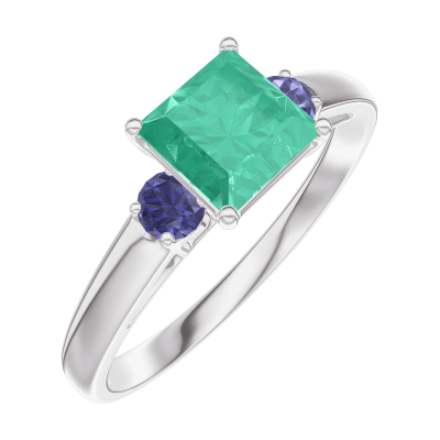 « L'ATELIER » Nº 166764Bague Or blanc 9 carats - Émeraude Princesse 0.7 carat - Pierres de côté Saphir bleu