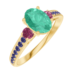 « L'ATELIER » Nº 166954Bague Or jaune 9 carats - Émeraude Ovale 0.7 carat - Pierres de côté Rubis - Sertissage Saphir bleu