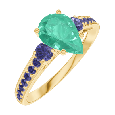« L'ATELIER » Nº167073Bague Or jaune 18 carats - Émeraude Poire 0.7 carat - Pierres de côté Saphir bleu - Sertissage Saphir bleu