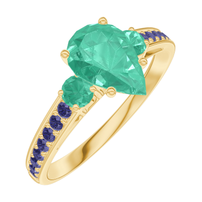 « L'ATELIER » Nº167093Bague Or jaune 18 carats - Émeraude Poire 0.7 carat - Pierres de côté Émeraude - Sertissage Saphir bleu
