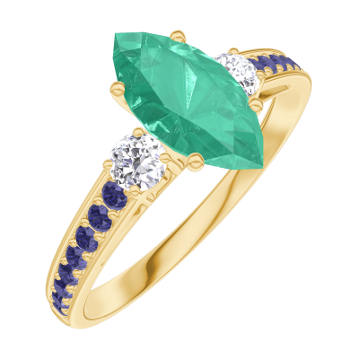 « L'ATELIER » Nº167134Bague Or jaune 9 carats - Émeraude Marquise 0.7 carat - Pierres de côté Diamant - Sertissage Saphir bleu